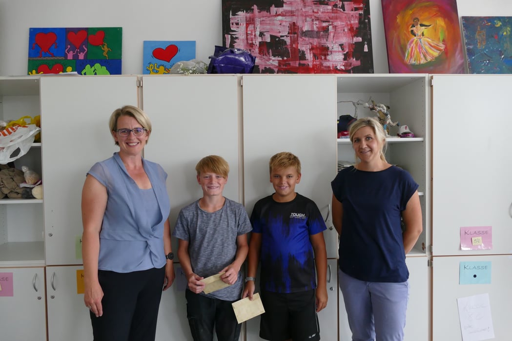 Bürgermeisterin Nicole Reschke, die Schüler Levi Wienbeck und Nico Blecher mit ihrer Klassenlehrerin Anna Meurer