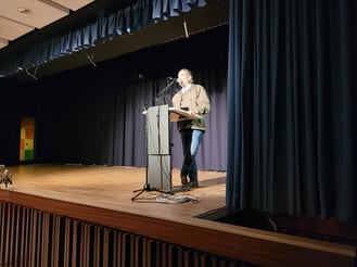 Am Freitag besuchte der Rapper die Esther-Bejarano-Gesamtschule in Freudenberg und nahm gemeinsam mit Schülerinnen und Schülern, Lehrkräften, Eltern und weiteren Gästen, u.a. aus der Freudenberger Politik und Verwaltung, an der Namensgebungsfeier der Schule teil. Er erzählte humorvoll von der ersten Kontaktaufnahme mit Frau Bejarano, ihrer eigentlichen Abneigung gegen Rap und ihrer Reaktion auf Yurtsevens Vorschlag, ob sie Interesse hätte, mit der Gruppe Microphone Mafia aufzutreten und zusammenzuarbeiten. Sie antwortete, sie wolle nichts mit „einer Mafia“ zu tun haben. Aus ein paar geplanten Liedern und Auftritten von Esther Bejarano und Microphone Mafia wurden letztendlich über 900 Konzerte und drei Alben. Yurtseven bedankte sich für die Namensgebung und rappte zum Schluss spontan mit der Projektwochenband über eine Schule ohne Rassismus. Der Song war während der Projektwoche Wir sind anders – Wir sind bunt unter der Leitung von Herrn Lucas und Herrn Puchelt entstanden.