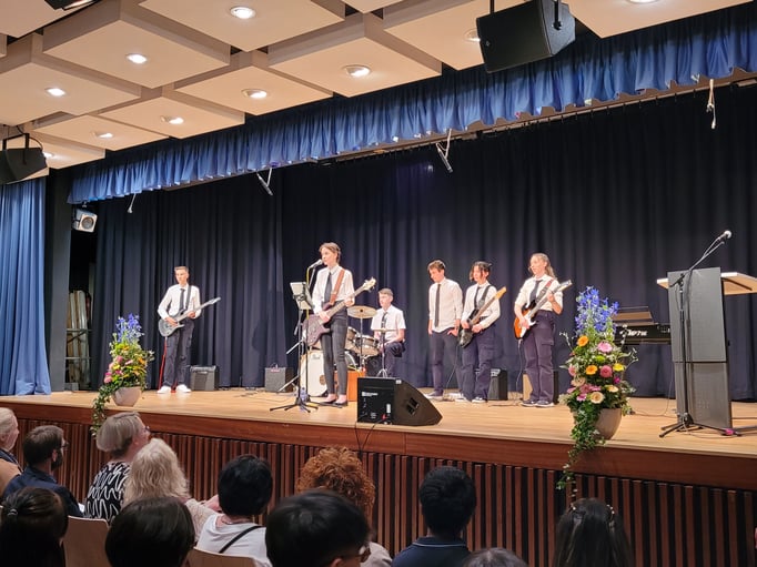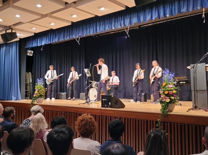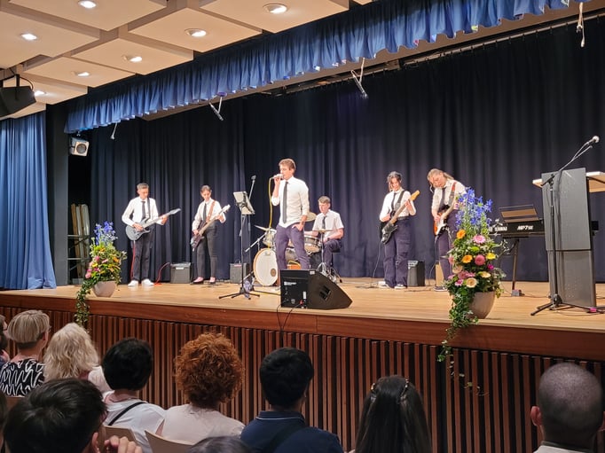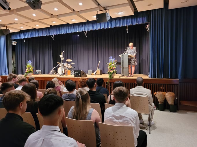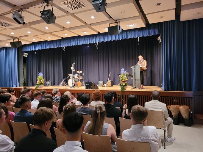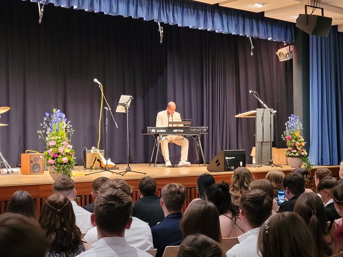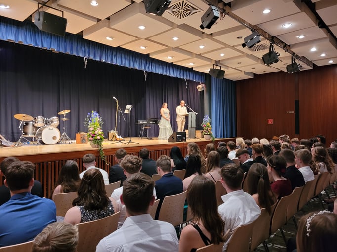 In einem würdigen Rahmen wurden unsere 10er heute in einen neuen Lebensabschnitt entlassen. Auf ihrer Schulabschlussfeier sprachen Bürgermeisterin Nicole Reschke, Schulleiter Reto Stein und Abteilungsleiterin Maike Schauerte und entließen die Schülerinnen und Schüler mit den besten Wünschen, vielen ermutigenden und auch ein paar wenigen mahnenden Worten auf den Weg in ein Ausbildungsverhältnis oder in die Oberstufe. Durch das Programm führten Arzu Kilic und Marco Becker, die u. a. gewählte Lehrertypen in verschiedenen Kategorien vorstellten oder ihre Mitschülerinnen und Mitschüler in gemeinsamen Erinnerungen schwelgen ließen. Für musikalische Höhepunkte sorgte ebenfalls Marco Becker, der die Veranstaltung am Keyboard einleitete. Unsere Schulband endlesscure spielte außerdem unter der Leitung von Herrn Puchelt verschiedene rockige Stücke, u. a. ein extra für den Abschluss des diesjährigen 10er-Jahrgangs geschriebenes Lied von Absolventin Lina Güldenring namens Bad Feeling.