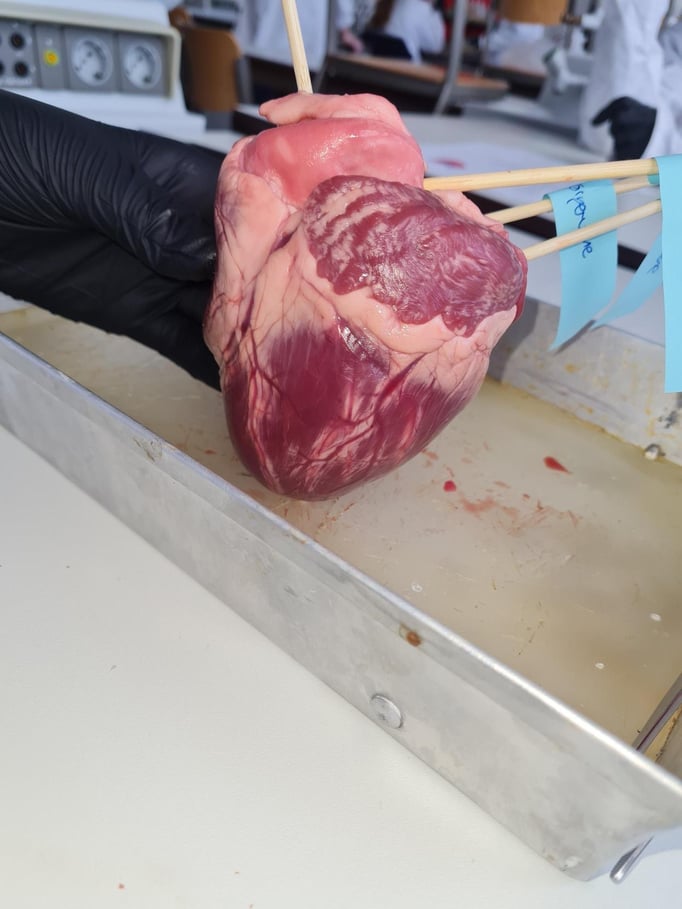 Mit Laborkitteln, Handschuhen und Skalpellen bewaffnet, untersuchten die Schülerinnen und Schüler während des ersten Termins die Schweineherzen. Neben den Vorhöfen und Herzkammern konnten sie auch die verschiedenen Venen und Arterien beobachten. Besonders beeindruckend war die Beobachtung der Schließfunktion der Taschenklappen zwischen den Herzkammern und Arterien, als Wasser in die Arterien eingeführt wurde.