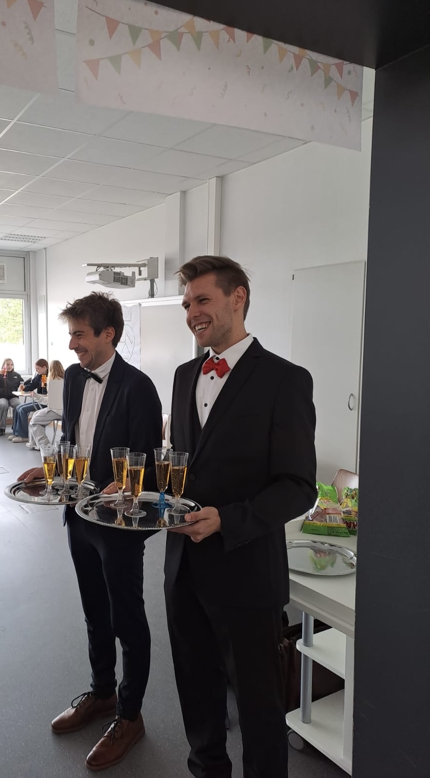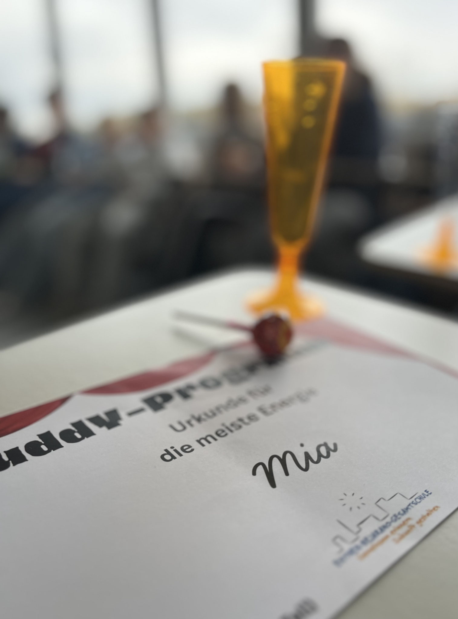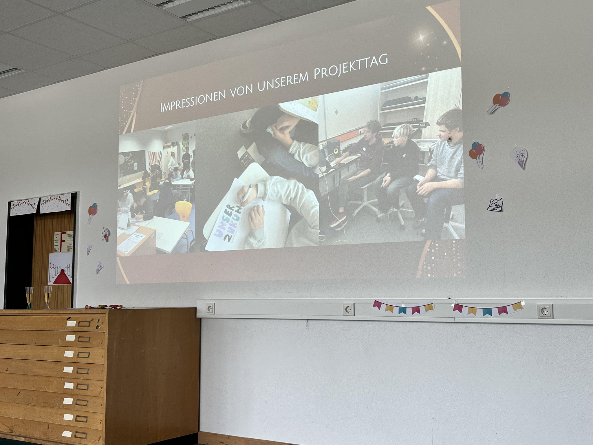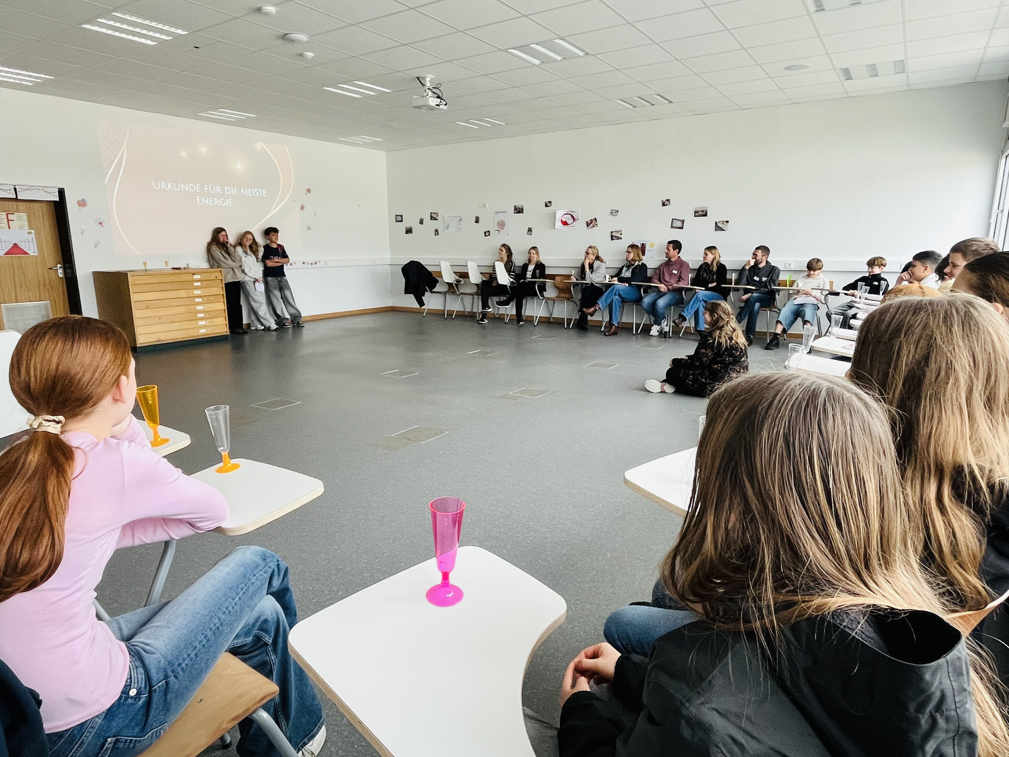 Nach Abschluss der kreativen Phase wurden die Ergebnisse im Rahmen einer feierlichen Würdigung präsentiert. In festlicher Atmosphäre – begleitet von Musik und einem Empfang mit Kindersekt – wurden die Beiträge der Klasse vor Publikum vorgestellt. Die Veranstaltung wurde von Frau Spornhauer, Herrn Dick und Herrn Puchelt eröffnet, die die Schülerinnen und Schüler in festlicher Kleidung begrüßten und für die herausragende Leistung der gesamten Klasse lobende Worte fanden.