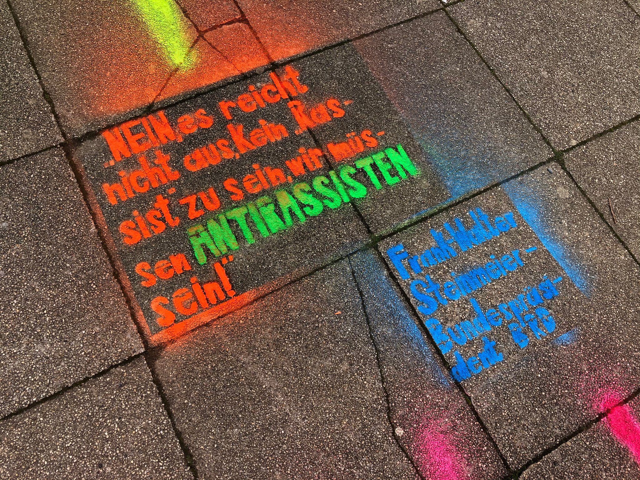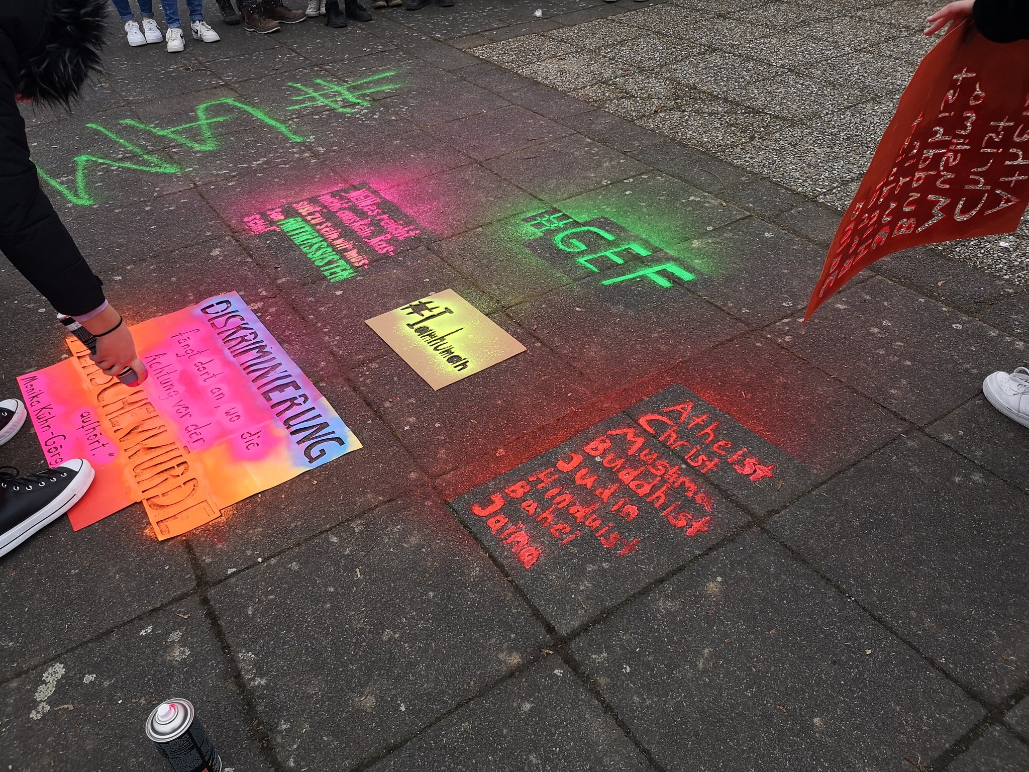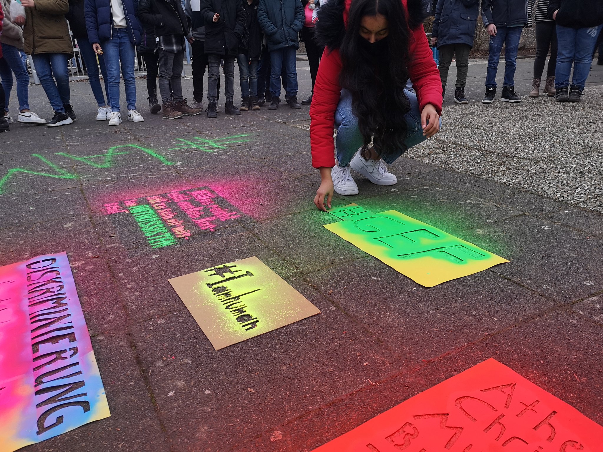 Zum Projekt „#Iamhuman“ sprühen wir mit Kreidefarben Sätze (Zitate, Sprüche oder Darstellungen) auf die Schulhöfe unserer Schule. Die Schülerinnen und Schüler werden so beim Betrachten der Abbildungen zum Nachdenken angeregt. Um dieses Unterfangen möglich zu machen, haben wir am 17. November 2020 bei unserem Projekttag damit begonnen, Schablonen mit Sprüchen zum Thema Antirassismus, Akzeptanz aller Religionen, Sexualitäten oder Herkunft anzufertigen. Leider hat uns das regnerische Wetter einen kleinen Strich durch die Rechnung gemacht, dennoch sind wir froh, am gleichen Tag das erste Zitat auf dem Schulhof der 8. – 10. Klasse betrachten zu können.